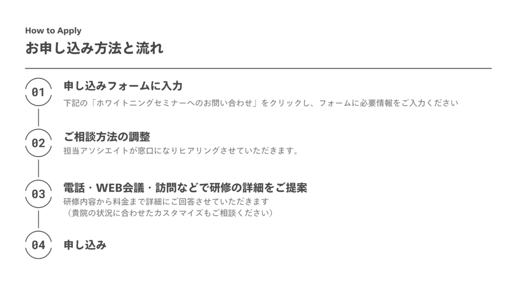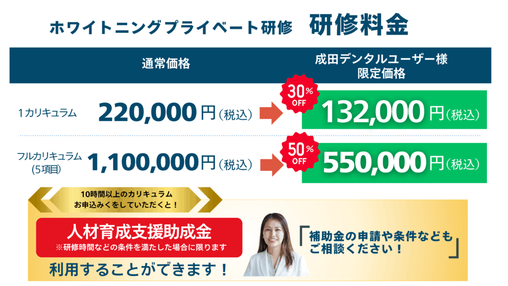 ホワイトニング専門衛生士が伝える本格ホワイトニング 2025年4月26日 最終更新日時 : 2025年10月14日 yoshiyuki.oka 期間限定! 成田デンタル×Me&Youコラボ研修のガイダンスセミナーを期間限定で公開中! どんな研修なの? この研修を受けるとどうなるのか? なぜホワイトニングなの? 本動画ではそんなホワイトニングコラボ研修に対しての疑問を解決!研修内容も一部もお見せします!歯科医師・歯科衛生士両方におすすめの内容になっていますので、ぜひご視聴ください! 無料セミナーのご視聴はコチラ!! ↓無料相談受付中↓ 金額を知りたい カスタマイズはどこまでできるの? 地方でも来てくれるの? まずはお気軽にご相談ください! コラボ研修へのお問い合わせ・ご相談はコチラ! HOMEに戻る