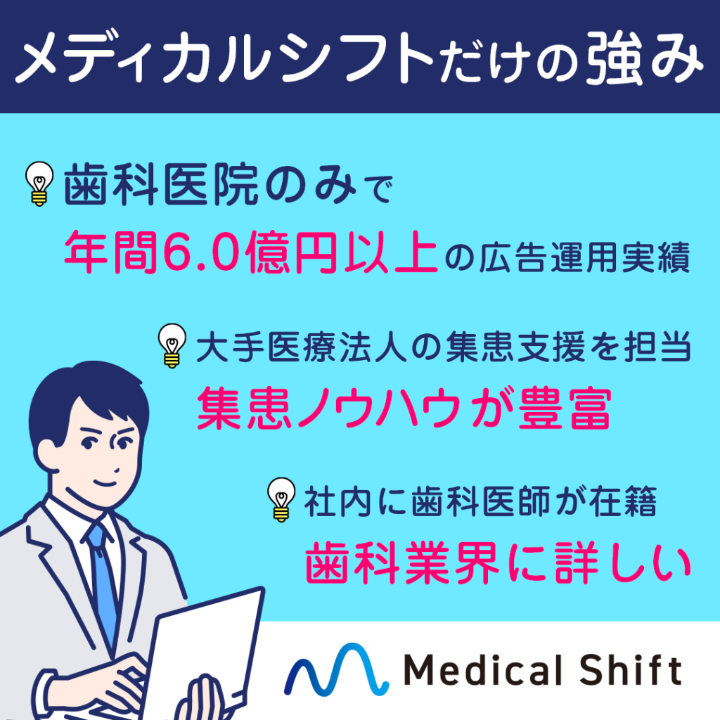 特にMedical Shiftは年間6.0億円以上もの広告運用実績(しかも歯科医院のみ)を誇り、大手医療法人の集患も数多く支援しているため、「歯科ならでは」の視点から具体的な対策を講じてくれます。