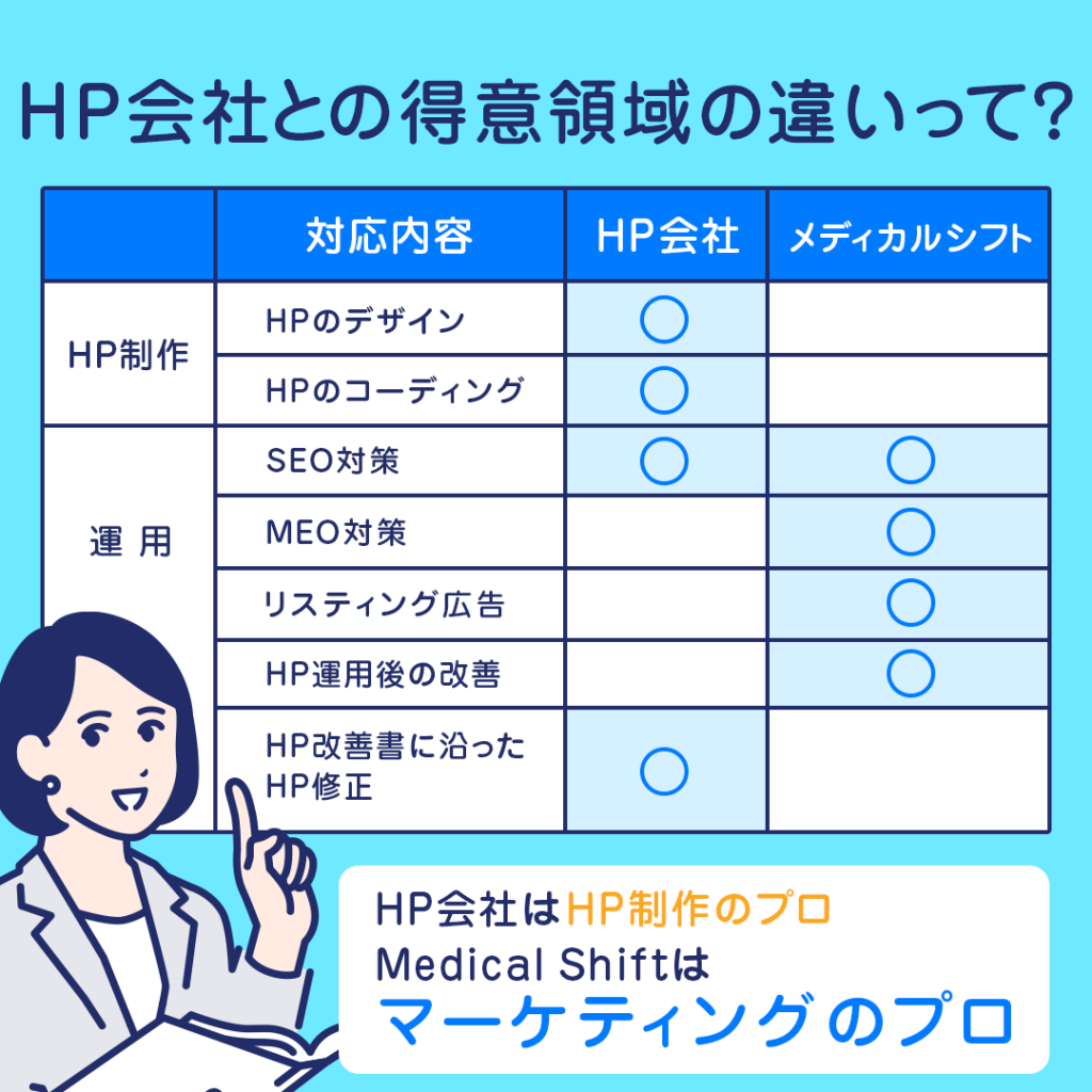 配信画像の一つでは、HP制作会社とMedical Shiftの対応領域を比較表にまとめています。