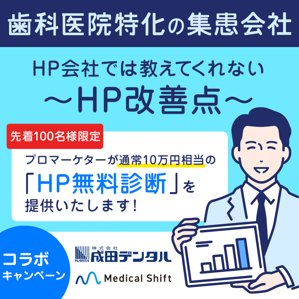 - 本サービス(HP無料診断)は株式会社Medical Shiftが提供するサービスであり、成田デンタルのサービスではございません。